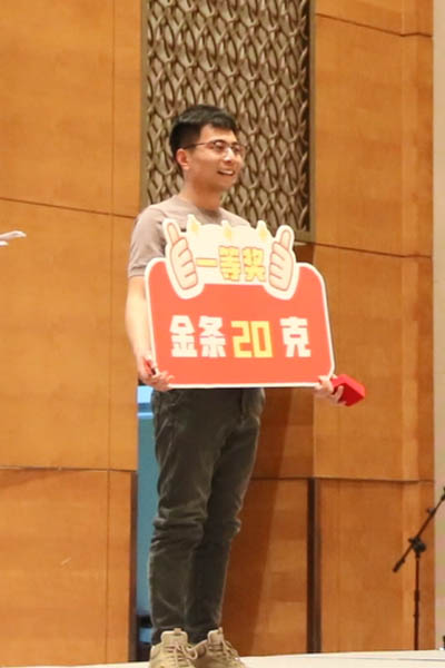 隨著三等獎的抽出,晚會氣氛達(dá)到一個小高潮。幸運(yùn)兒們滿心歡喜地領(lǐng)取了獎品5克金條。